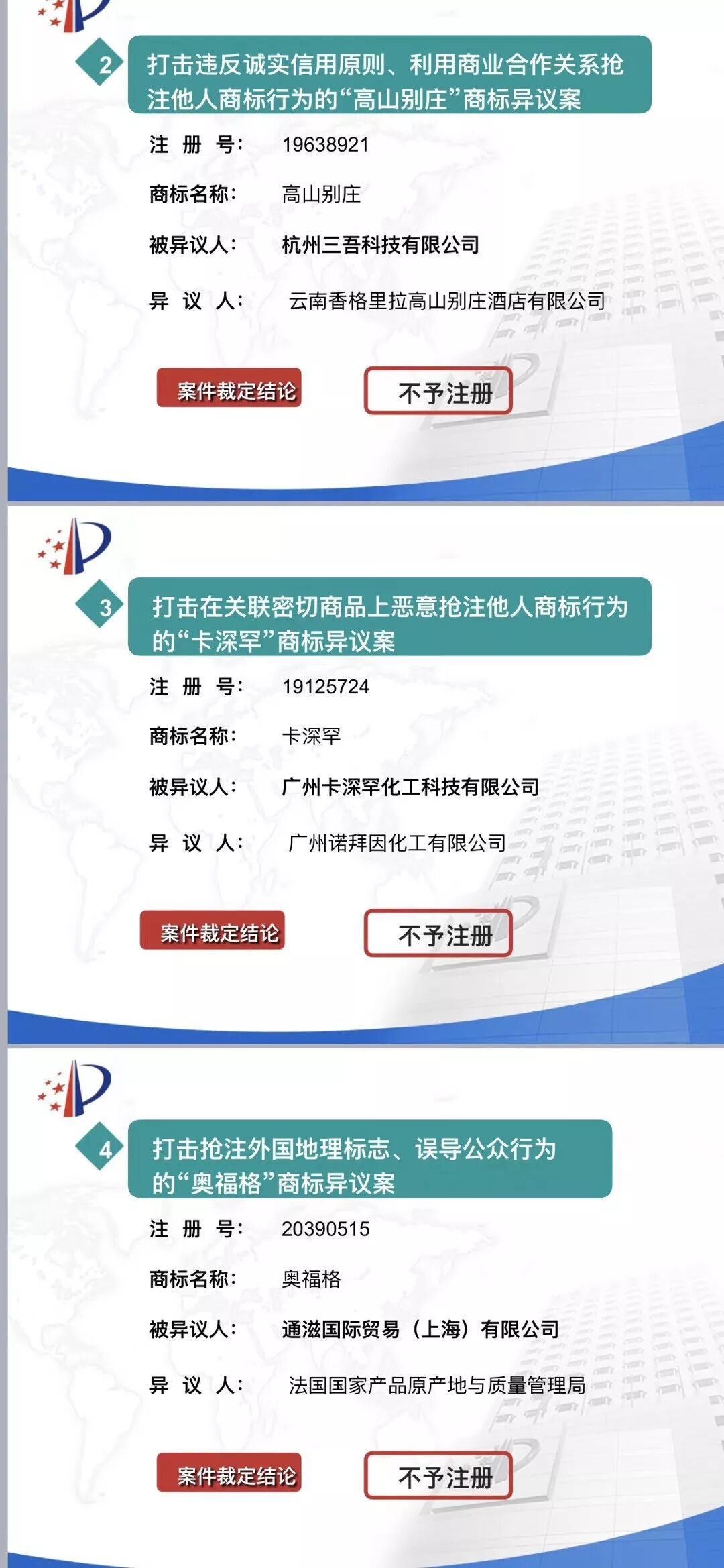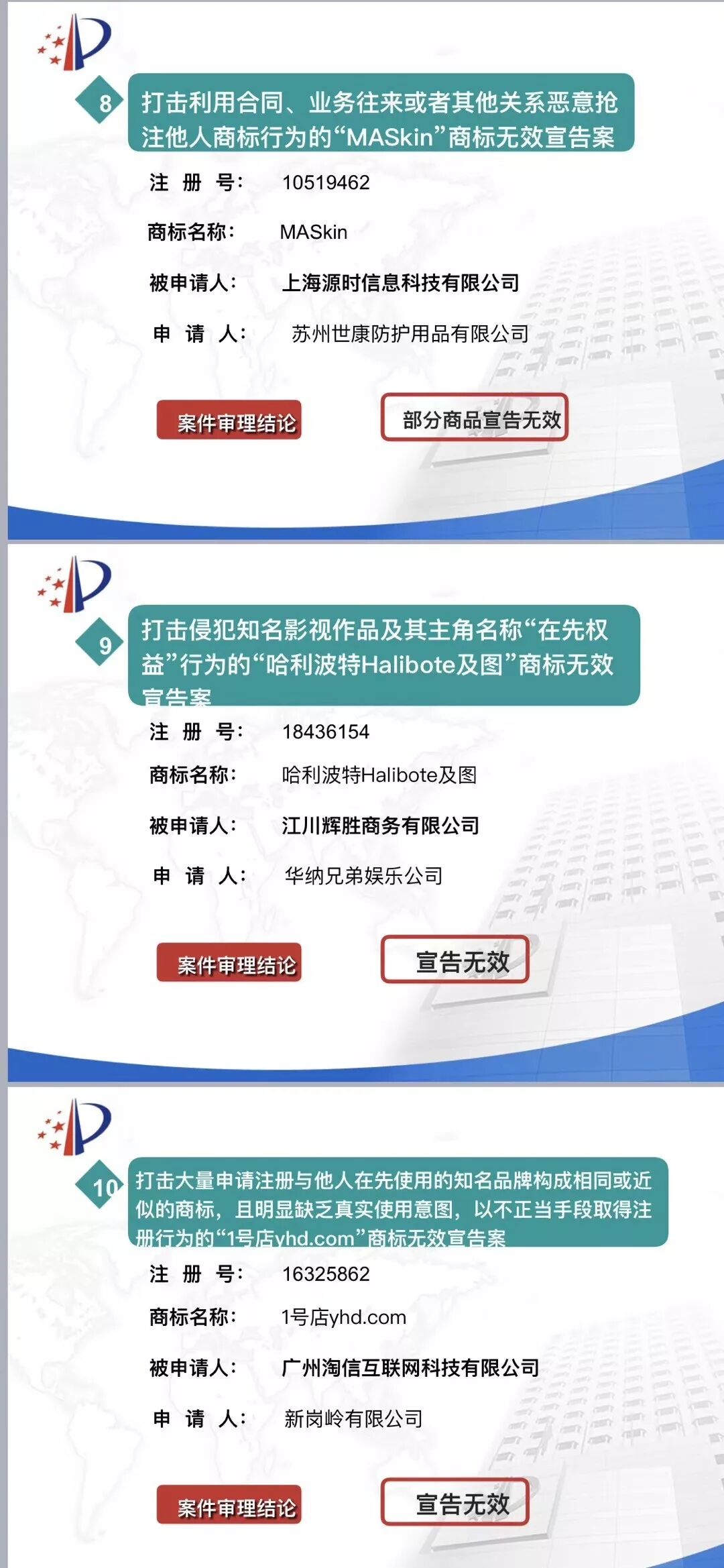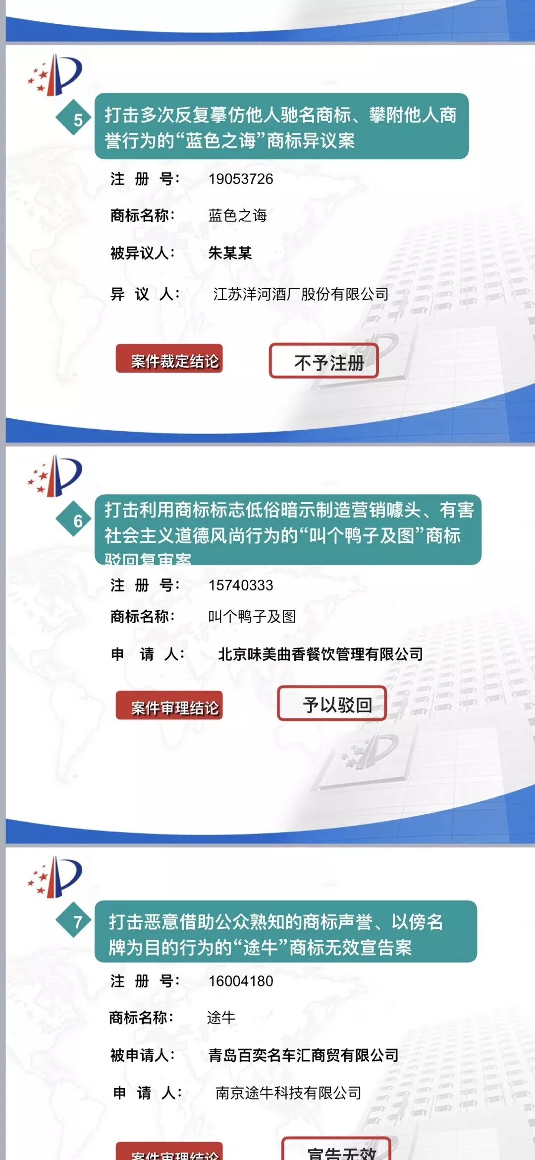 4月25日,2019年国家知识产权局开放日活动在京举办。启动仪式上,国家知识产权局商标局局长崔守东发布了2018年度商标领域典型案例,具体如下: