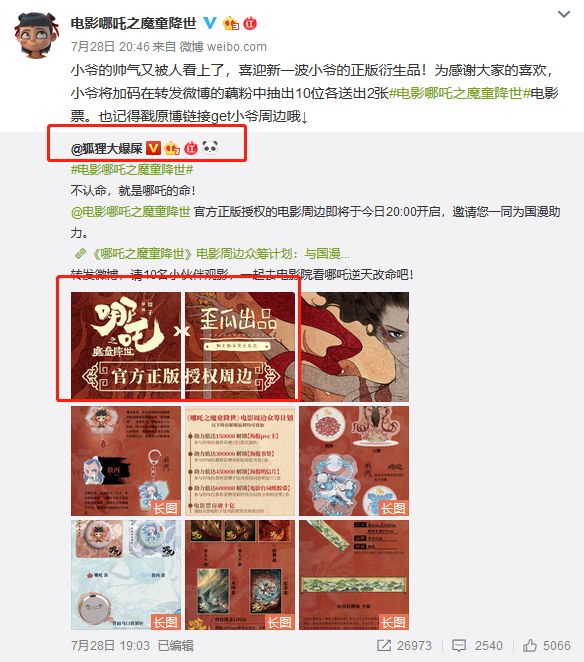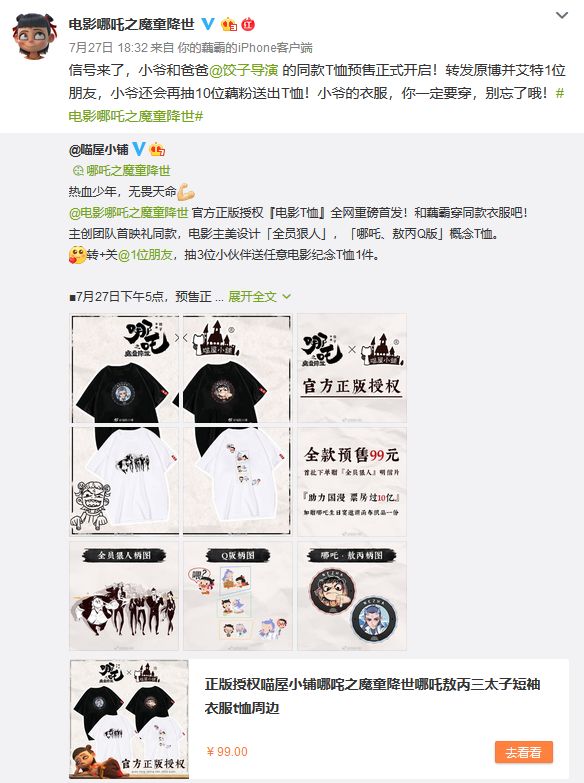 7月28日,电影《哪吒之魔童降世》官方微博曾转发了官方授权店铺的消息。