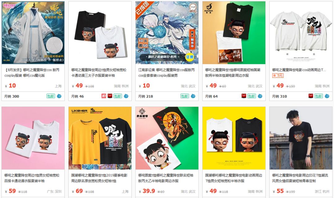 随着《哪吒之魔童降世》的热播,电影中的哪吒等卡通人物形象受到大家追捧。到目前为止,电影票房已经超过7亿。在网络电商平台,不少商家开始售卖关于影片的周边产品,包括T恤衫、手机壳、抱枕上印有电影中的哪吒形象,售价几十到几百不等。电影宣传方表示:“目前除了官微在众筹售卖的之外,都为盗版。”