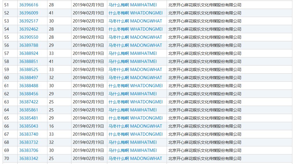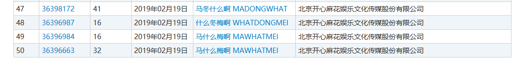 更有趣的是,开心麻花不仅申请了“马冬梅”,连“马冬什么啊”、“什么冬梅啊”、“马什么梅啊”也一起申请了商标,并且是中英文拼音混合商标,后面分别带有“MADONGWHAT”、“WHATDONGMEI”、“MAWHATMEI”![]()