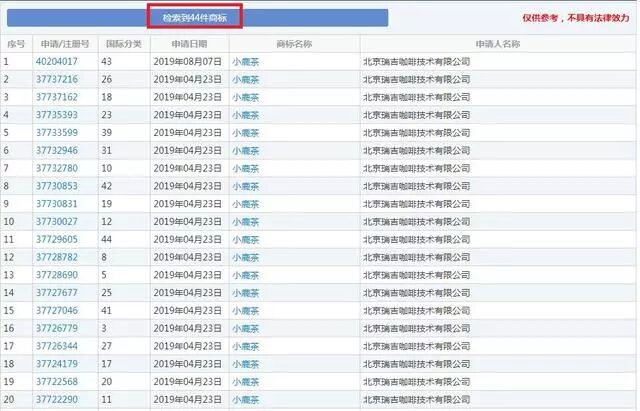 随后反应过来的瑞幸,立马展开了对于“小鹿茶”商标的保护!截止今天,瑞幸一共申请了44枚“小鹿茶”商标,而商标类别总共是45类!