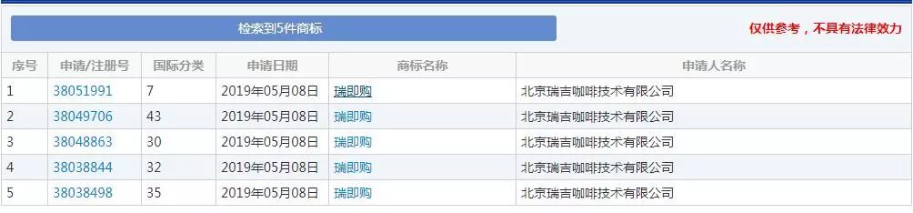 7类是机械设备类的,瑞即购是做自助咖啡机,说明瑞幸至少也有在研发新的咖啡机!30类和32类,都是涉及到食品产品这块,瑞幸主营的产品就是这两大类,这两枚商标也是做茶饮、咖啡等必备的两枚商标!35类另称“全能商标”,你打广告、销售就必须得用到它!43类,直白地就是开店必须!如果你想从事连锁经营管理,第43类必须注册!不过在“瑞即购”之前,瑞幸的另一个品牌商标却没有这么幸运!