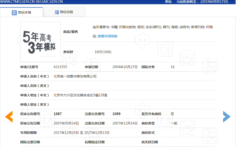 “5年高考,3年模拟”真真确确已经注册成功了十多年了!!!同时该公司针对此商标做了几次防御注册,那商标被驳回又是怎么回事?原来该公司在2004年申请了16类上的“5年高考,3年模拟”并获准注册,核定使用范围为“连环漫画书; 书籍; 印刷出版物; 报纸”等商品,在2017年欲在16类做延伸项目申请,遭到商标局以《商标法》第十一条第一款第(二)项规定的不得作为商标注册的标志为由予以驳回,同时该公司做了复审,商评委依然以《商标法》第十一条第一款第(二)项规定不予支持。
