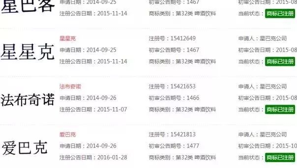 “星巴克”商标也是一样,也递交了很多类似商标,像“星星克”、“爱巴克”、“罗巴克”等。