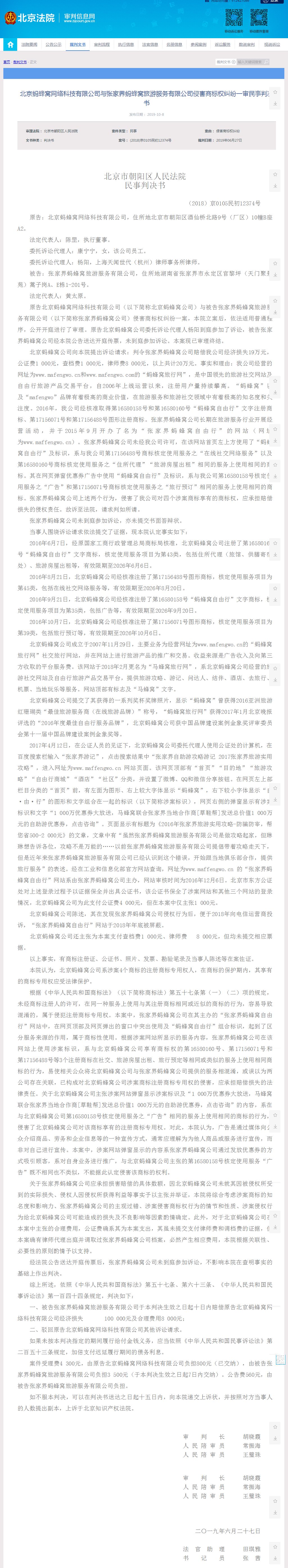 10月8日,北京法院审判信息网公开了一起涉及“蚂蜂窝自由行”商标的侵权纠纷案。因认为张家界蚂蜂窝旅游服务有限公司(下称“张家界蚂蜂窝公司”)擅自使用“蚂蜂窝自由行”图文商标进行推广宣传,主打旅游服务业务的北京蚂蜂窝网络科技有限公司(下称“北京蚂蜂窝公司”)将其诉至北京朝阳法院并索赔20万元。法院一审判决,张家界蚂蜂窝公司对“蚂蜂窝自由行”标识的部分使用行为侵害了北京蚂蜂窝公司享有的商标专用权,应向其赔偿经济损失共计108000元。