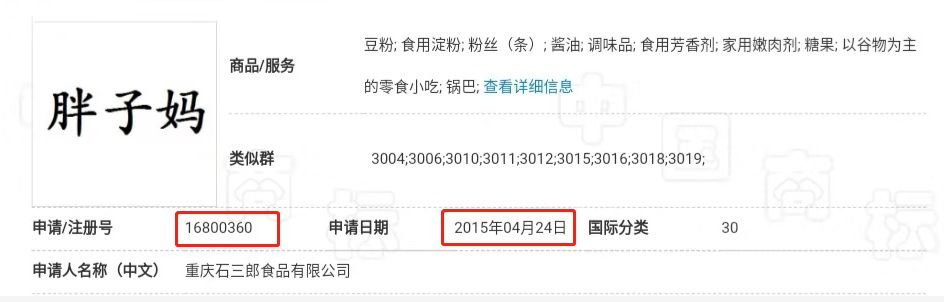 今年5月,这家胖子公司将重庆石三郎食品有限公司(下称胖子妈公司)告上法庭,被告公司可谓对胖子公司的产品模仿的淋漓尽致,不仅在名称上和胖子极其相似,就连包装也几乎一模一样。通过商标官网查询,“胖子妈”商标比“胖子”商标申请晚了整整20年,直到2015年才申请注册。