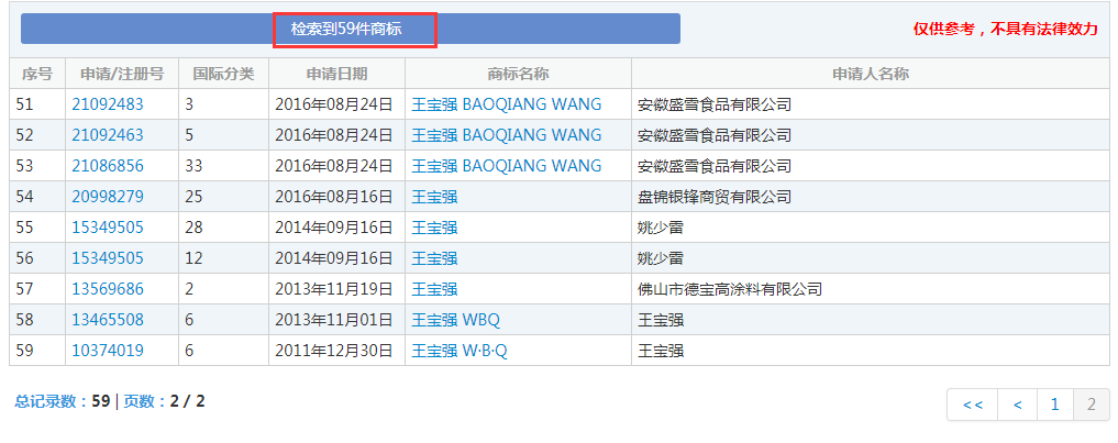 小编在商标网上又查询了“王宝强”商标的申请情况,不查不知道,一查吓一跳!包含“王宝强”字样的商标共有59件;
