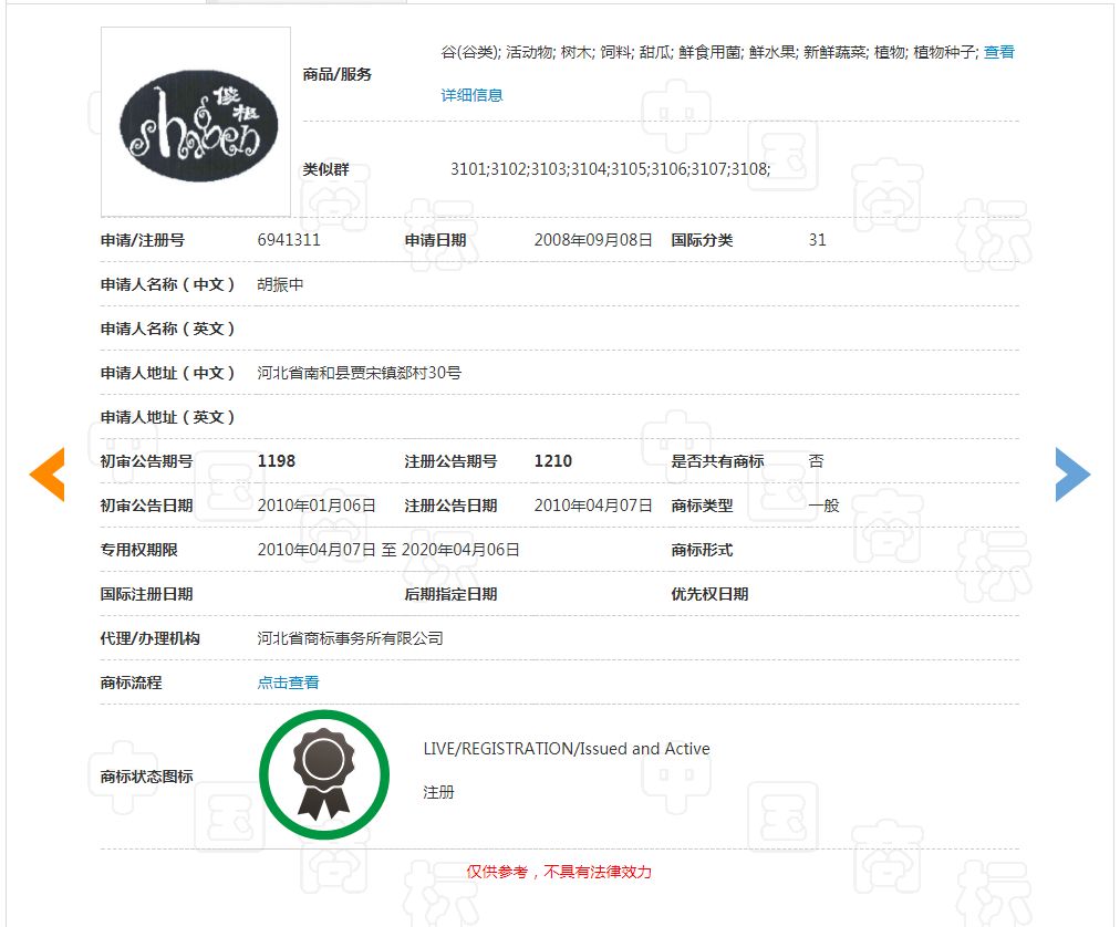 2004年伴随着王宝强在《天下无贼》中的走红,“傻根”商标也开始被申请在各个类别。比如他的家乡河北省邢台市南和县贾宋镇借用他的名人效应,把注册的“傻根”牌无公害农产品蔬菜源源不断地销往全国各地。笔者在商标网上查询了“王宝强”商标的申请情况,包含“王宝强”字样的商标共有59件,但申请人并非王宝强。随后为保护个人姓名的合法权益,王宝强在2018年4月17日通过旗下公司北京乐开花影业有限公司申请了全类45个商标。