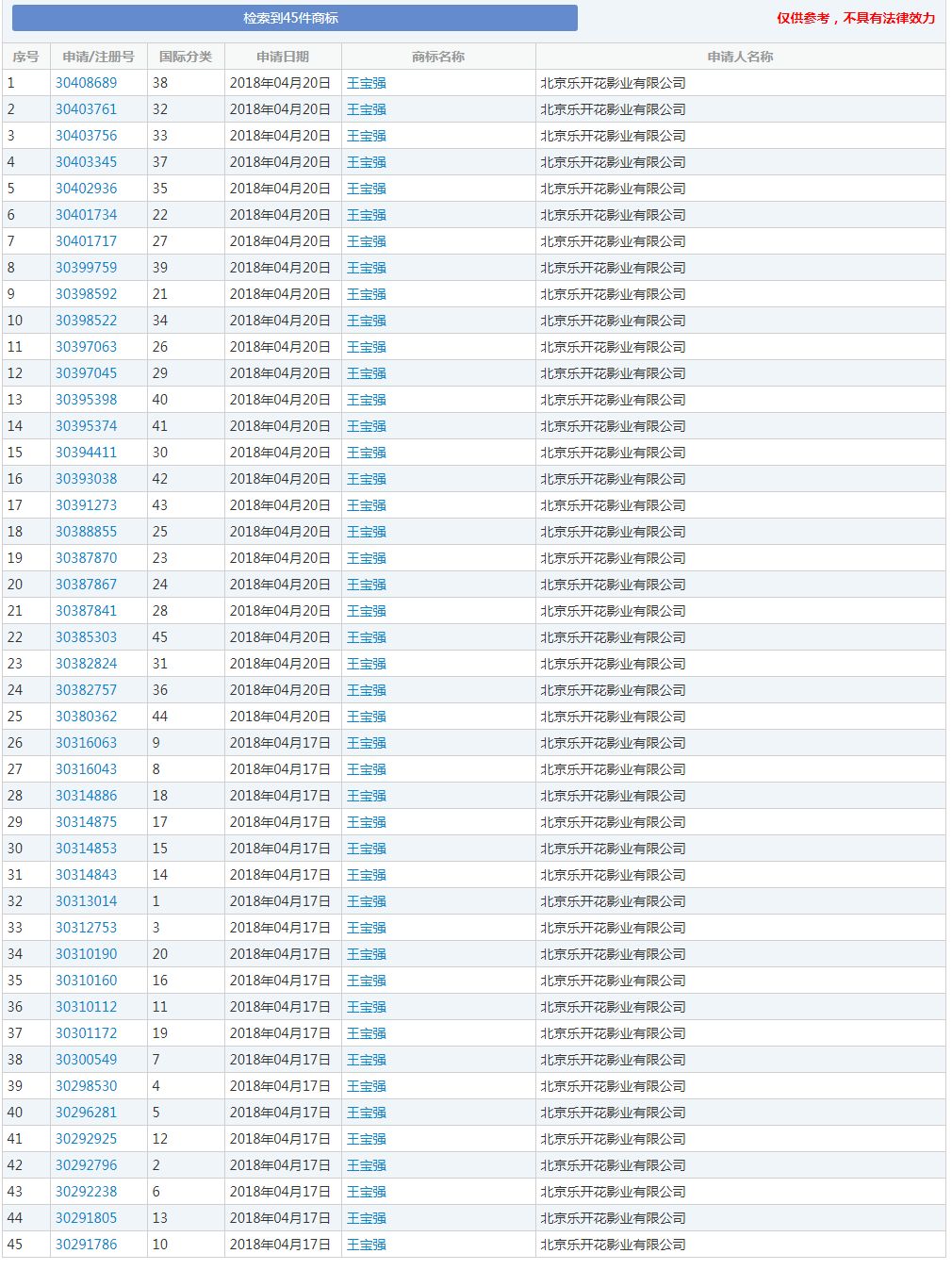 也许是受到了姓名被“抢注”的启示,王宝强在2018年4月17日通过旗下公司北京乐开花影业有限公司(以下简称“乐开花影业”)一口气申请了全类45个商标,对自己的名字“王宝强”进行了全面、完整的商标保护,防止其他人傍名牌,搭便车,损害自己的人格利益、财产利益以及消费者的合法权益。