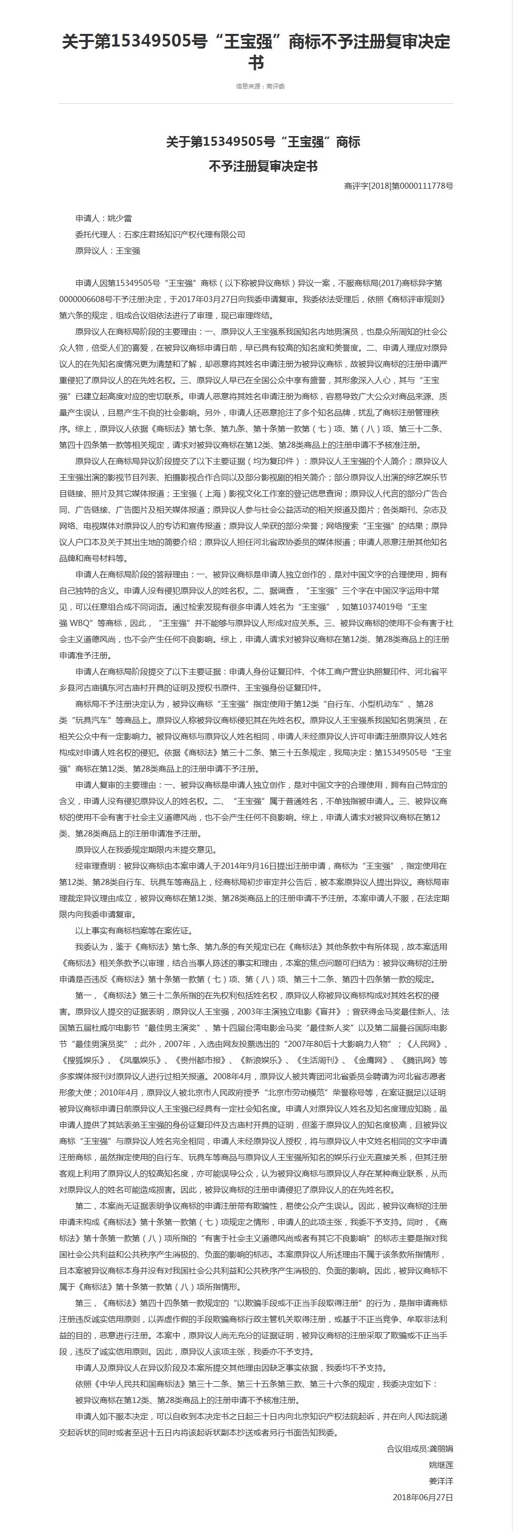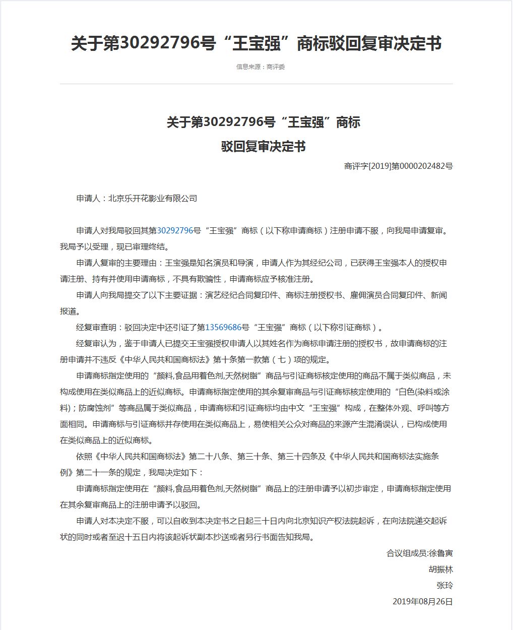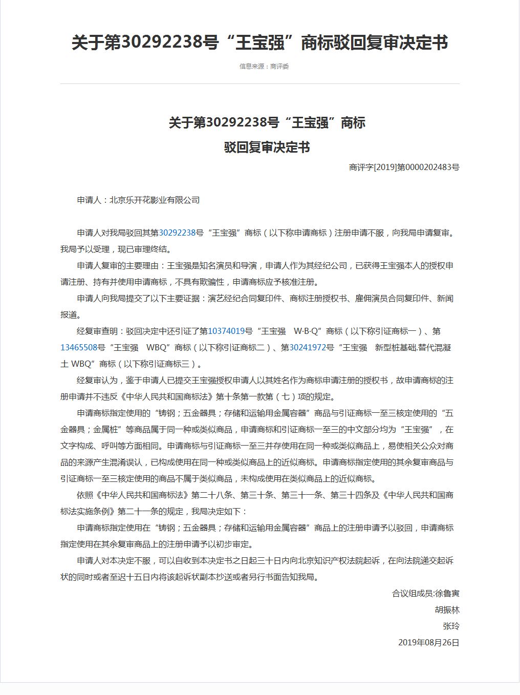 决定书显示:第30292238号“王宝强”商标指定使用在“铸钢;五金器具;存储和运输用金属容器”商品上的注册申请予以驳回,申请商标指定使用在其余复审商品上的注册申请予以初步审定。