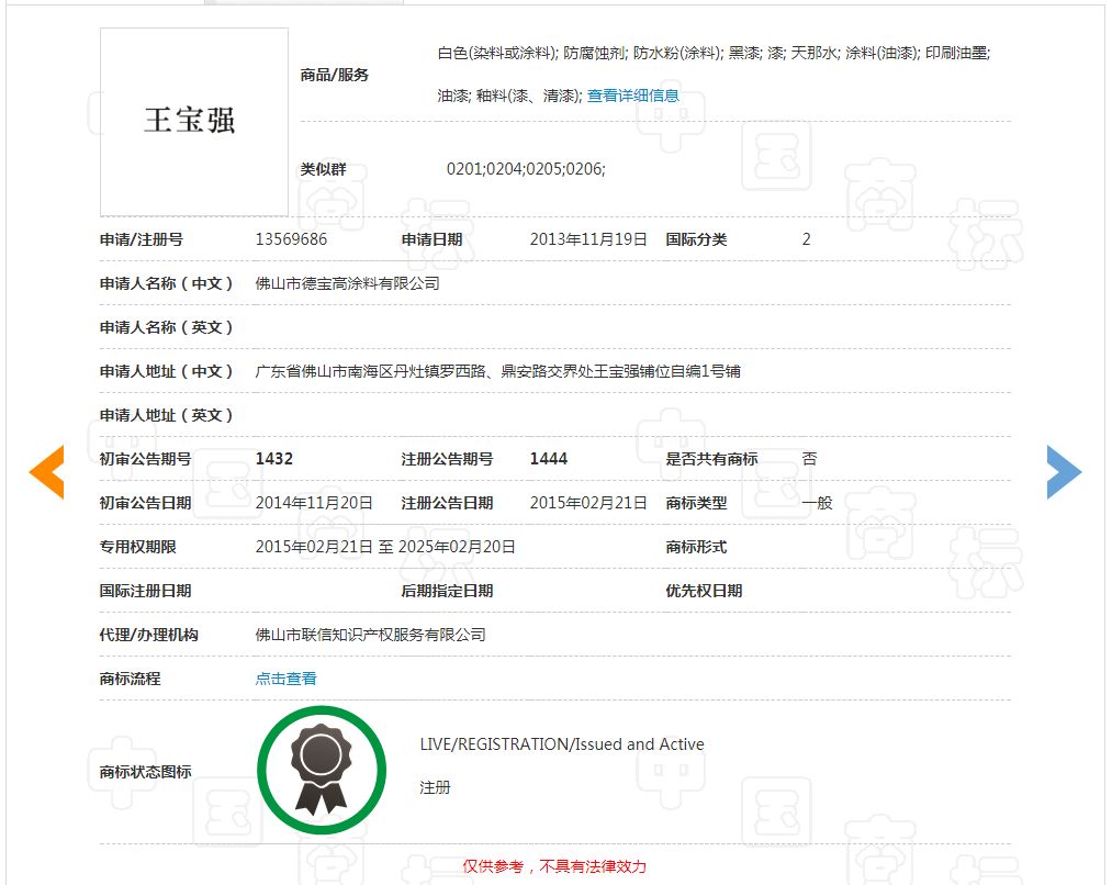 其中“王宝强”不仅被申请在了第2类油漆材料;