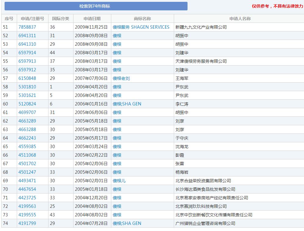 2004年伴随着王宝强在《天下无贼》中的走红,“傻根”商标也开始被申请在各个类别。