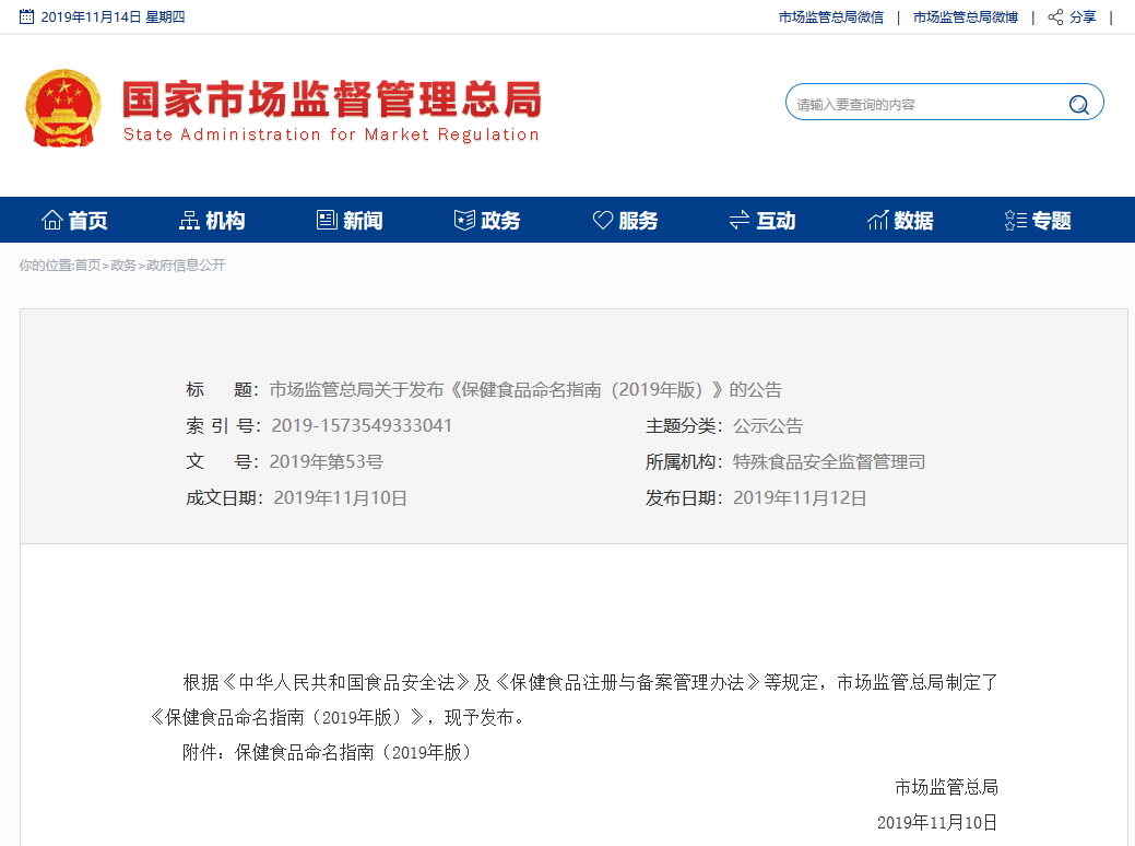 市场监管总局关于发布《保健食品命名指南(2019年版)》的公告
