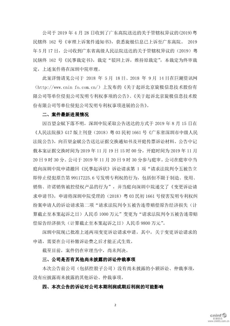 公司于 2019 年 4 月 28 日收到了广东高院送达的关于管辖权异议的(2019)粤民辖终 162 号《审理上诉案件通知书》,获悉旋极信息已上诉至广东高院。2019年 5 月 17 日,公司收到广东省高级人民法院送达的关于管辖权异议的(2019)粤民辖终 162 号《民事裁定书》,裁定“驳回上诉,维持原裁定”,本裁定为终审裁定,上述案件将在深圳中院审理。