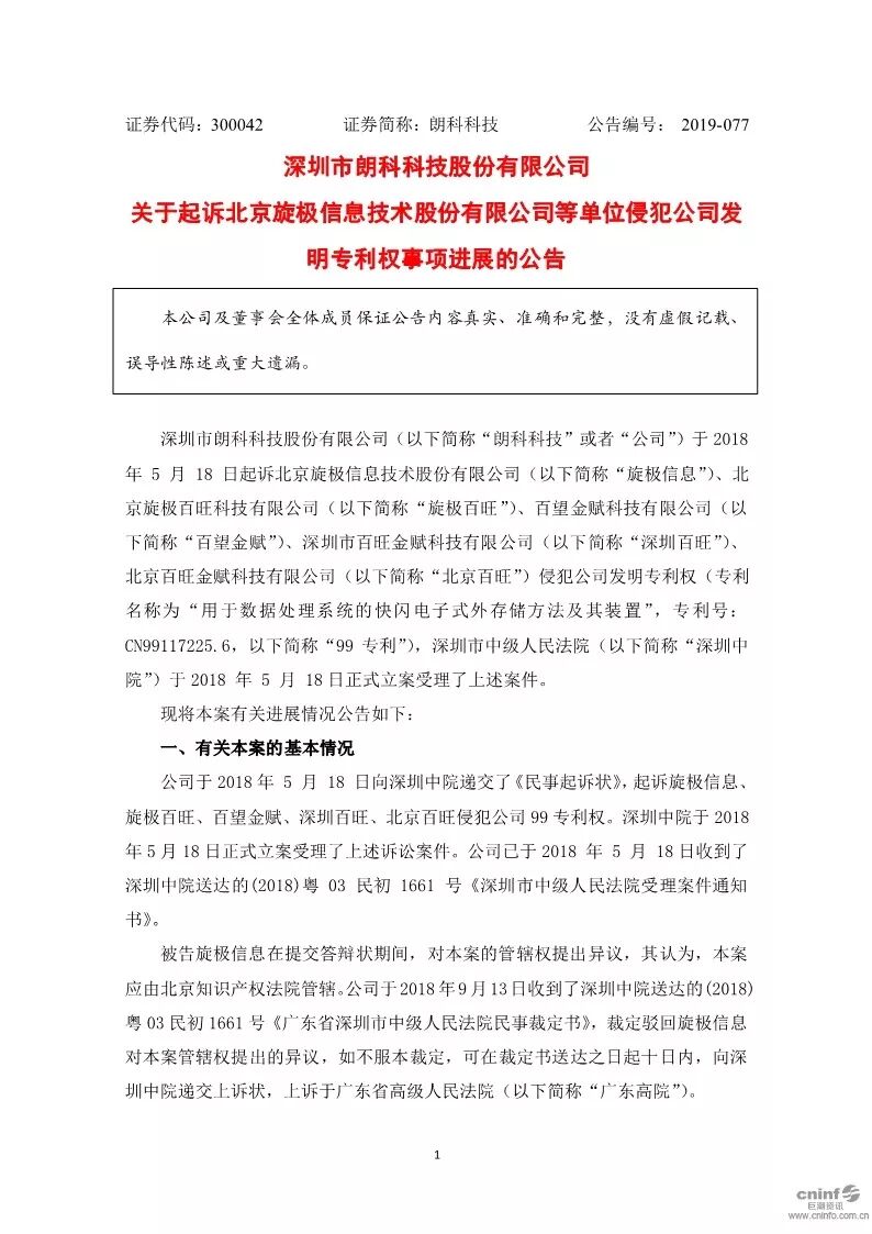 朗科科技于 2018年5月18日起诉北京旋极信息技术股份有限公司(以下简称“旋极信息”)、北京旋极百旺科技有限公司(以下简称“旋极百旺”)、百望金赋科技有限公司(以下简称“百望金赋”)、深圳市百旺金赋科技有限公司(以下简称“深圳百旺”)、北京百旺金赋科技有限公司(以下简称“北京百旺”)侵犯公司发明专利权(专利名称为“用于数据处理系统的快闪电子式外存储方法及其装置”,专利号:CN99117225.6,以下简称“99 专利”),深圳市中级人民法院(以下简称“深圳中院”)于 2018 年 5 月 18 日正式立案受理了上述案件,公司于 2018 年 5 月 18 日收到了深圳中院送达的(2018)粤 03 民初 1661 号《深圳市中级人民法院受理案件通知书》。
