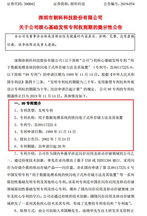 2019年11月14日,朗科科技的核心基础发明专利“用于数据处理系统的快闪电子式外存储方法及其装置”(专利号:ZL99117225.6)在经过20年保护期后,失效了。