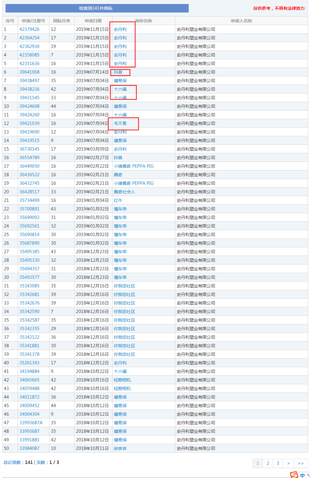 此外,还有网友发现,抢注毛不易商标的还有一个家喻户晓的复合肥公司——史丹利。查询显示,史丹利塑业有限公司相关知识产权信息共141条,包含史丹利、毛不易、十六福、抖音、小猪佩奇 PEPPA PIG、佩奇、佩奇社会人、红牛、懂车帝、你我您社区、轻颜相机等商标。