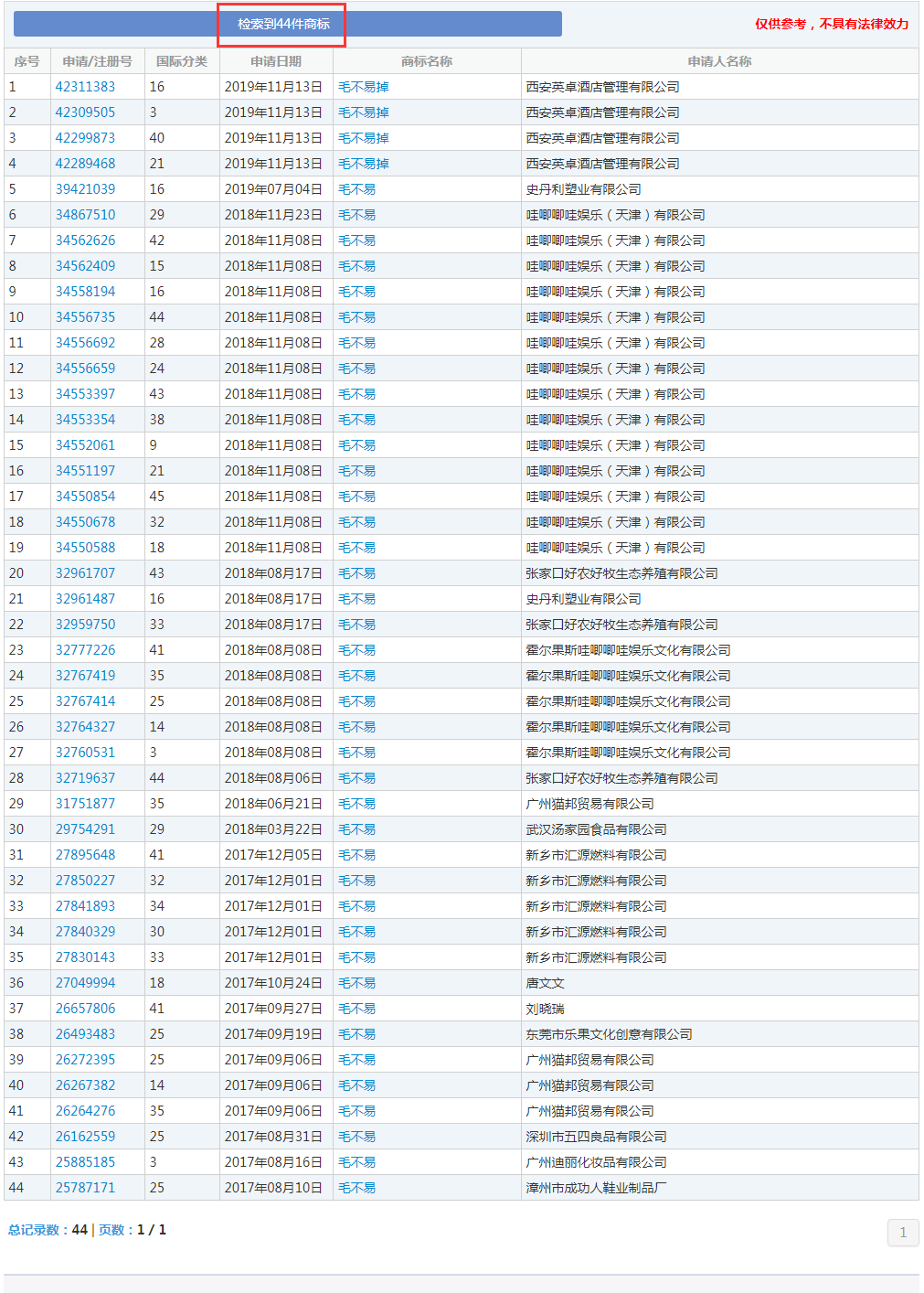 商标局网站数据显示,截至2020年7月19日,有关毛不易的商标申请目前为44件,其中,申请人为哇唧唧哇娱乐(天津)有限公司的申请只有14件,还有5件为霍尔果斯哇唧唧哇娱乐文化有限公司申请,其余25件均来自于其他公司。被抢注的毛不易商标类别包括16类办公用品、33类酒、43类餐饮住宿、44类医疗园艺、35类广告销售、29类食品等,涉及国内多家公司。