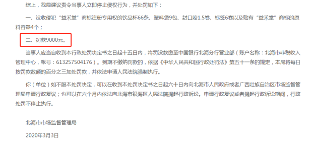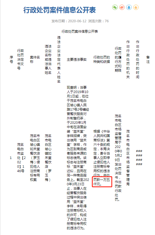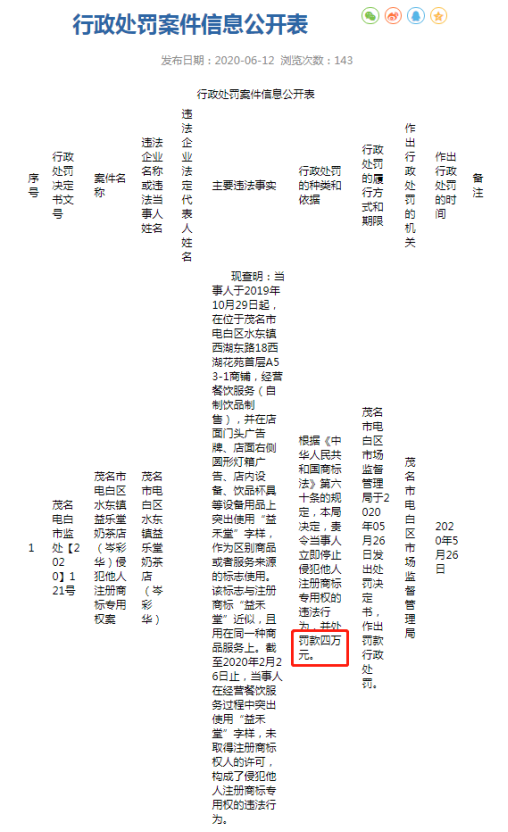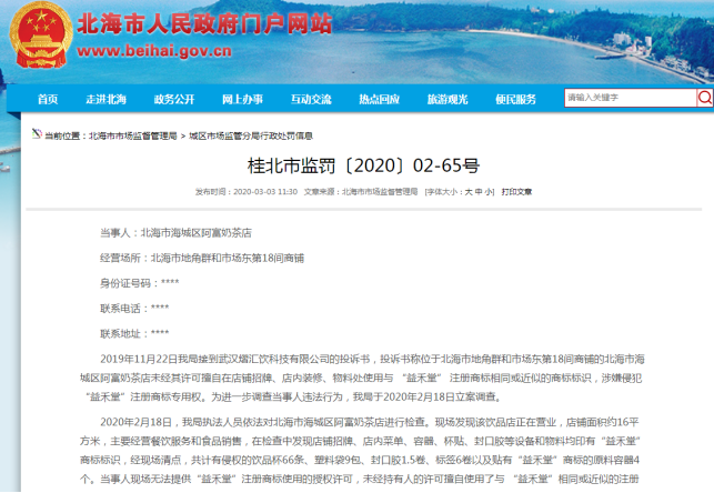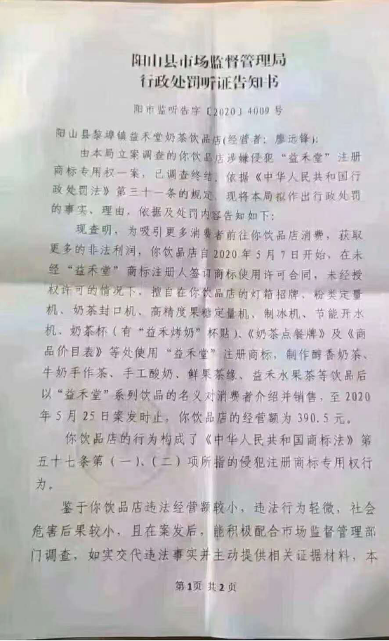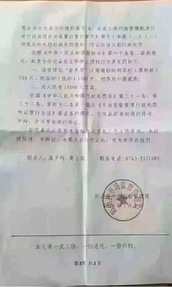 事情经过是这样的:阳山县一家奶茶饮品店,自今年5月7日开始,在没有经过“益禾堂”商标注册人的授权许可下,擅自使用了“益禾堂”商标,虽然经营额只有390.5元,但由于其行为已构成侵犯他人商标专用权的侵权行为,最终被处罚没收相关侵权产品,罚款人民币10000元。