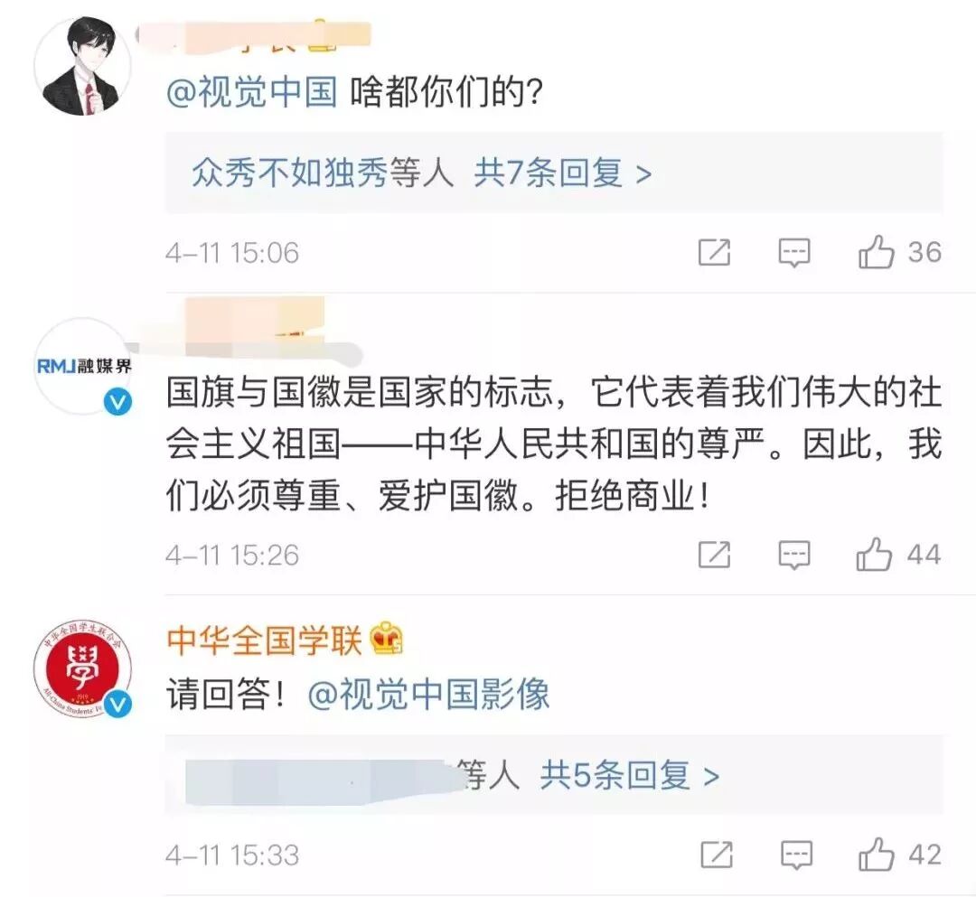 有网友发现国旗国徽图片的“图片使用说明”均显示:“此图片是编辑图片,如用于商业用途,请致电400-818-2525或咨询客户代表”,版权所有显示“1995-2019视觉中国”。