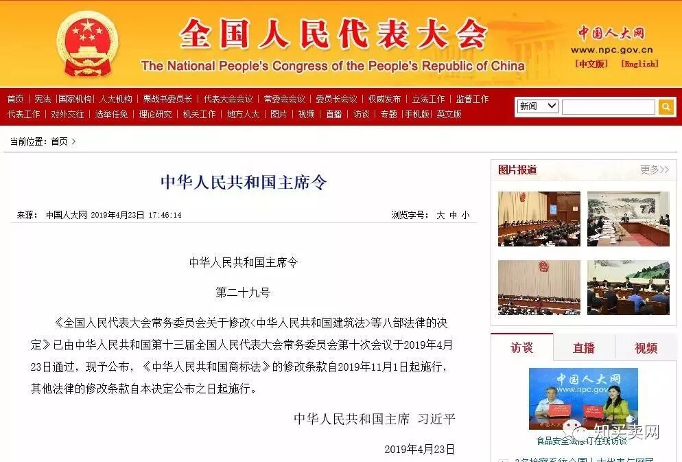 2019年4月23日,第十三届全国人民代表大会常务委员会第十次会议通过了对《中华人民共和国商标法》作出修改的决定。《中华人民共和国商标法》的修改条款自2019年11月1日起施行。